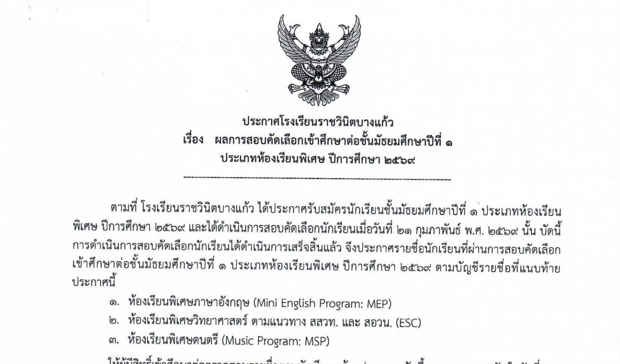 การรับนักเรียนห้องเรียนพิเศษชั้นมัธยมศึกษาปีที่ 1และ4 ปีการศึกษา 2569