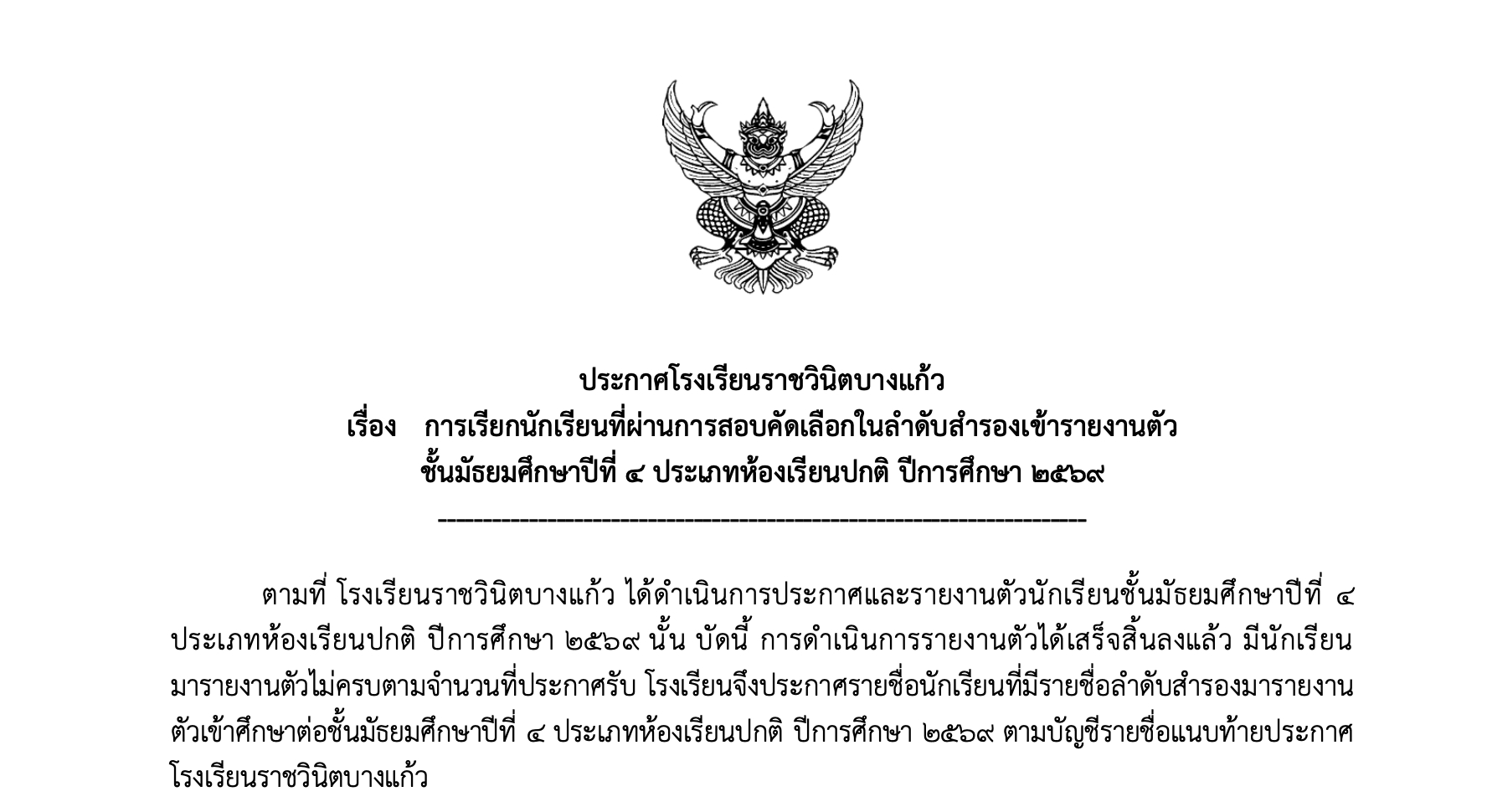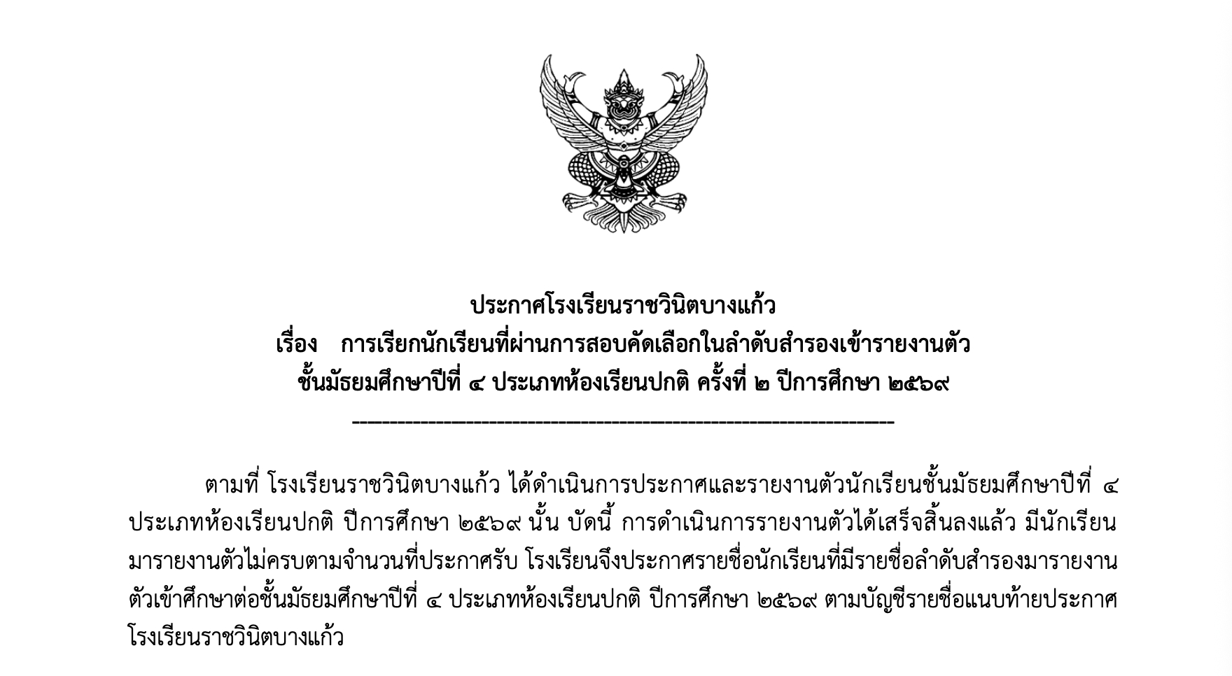 ประกาศเรียกนักเรียนที่ผ่านการสอบคัดเลือกในลำดับสำรองเข้ารายงานตัว ชั้นมัรยมศึกษาปีที่ ๔ ประเภทท้องเรียนปกติ ปีการศึกษา ๒๕๖๙ 4 เมษายน 2026