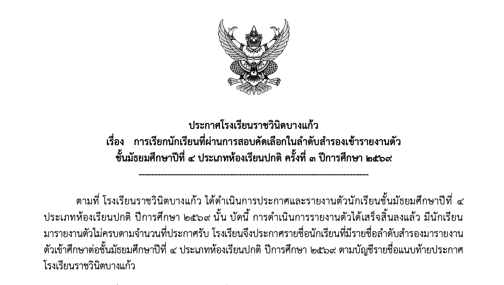 หน้าหลัก โรงเรียนราชวินิตบางแก้วยินดีต้อนรับ | WELCOME TO RATWINIT BANGKAEO SCHOOL ข่าวประชาสัมพันธ์ ประกาศการรับสมัครผู้ประกอบการและแจ้งเกณฑ์การประเมินอาหารสำหรับร้านจำหน่ายอาหารโรงเรียนราชวินิตบางแก้ว 10 เมษายน 2026 การเรียกนักเรียนที่ผ่านการสอบคัดเลือกในลำดับสำรองเข้ารายงานตัว ชั้นม.๔ ประเภทห้องเรียนปกติ ครั้งที่ ๓ ปีการศึกษา ๒๕๖๙ 7 เมษายน 2026 การเรียกนักเรียนที่ผ่านการสอบคัดเลือกในลำดับสำรองเข้ารายงานตัว ชั้นม.๔ ประเภทห้องเรียนปกติ ครั้งที่ ๒ ปีการศึกษา ๒๕๖๙ 5 เมษายน 2026 ประกาศเรียกนักเรียนที่ผ่านการสอบคัดเลือกในลำดับสำรองเข้ารายงานตัว ชั้นมัรยมศึกษาปีที่ ๔ ประเภทท้องเรียนปกติ ปีการศึกษา ๒๕๖๙ 4 เมษายน 2026 ประกาศรายชื่อผู้มีสิทธิ์มอบตัวเข้าศึกษาต่อชั้นมัธยมศึกษาปีที่ ๔ ห้องเรียนปกติ ปีการศึกษา ๒๕๖๙ 3 เมษายน 2026 ประกาศการเรียกนักเรียนที่ผ่านการสอบคัดเลือกในลำดับสำรองเข้ารายงานตัว ชั้นม.๑ ห้องเรียนปกติ ปีการศึกษา ๒๕๖๙ 1 เมษายน 2026 ดูทั้งหมด จดหมายข่าว ดูทั้งหมด ภาพกิจกรรม พิธีมอบประกาศนียบัตร นักเรียนผู้สำเร็จการศึกษา ปีการศึกษา 2568 ชั้นมัธยมศึกษาปีที่ 3 และปีที่ 6 การรับรายงานตัวและเลือกแผนการเรียน นักเรียนระดับชั้น ม.1 ประเภทห้องเรียนปกติ การสอบคัดเลือกนักเรียนชั้นมัธยมศึกษาปีที่ 4 ปีการศึกษา 2569 ประเภทห้องเรียนปกติ การสอบคัดเลือกนักเรียนชั้นมัธยมศึกษาปีที่ 1 ปีการศึกษา 2569 ประเภทห้องเรียนปกติ การสอบคัดเลือกนักเรียนความสามารถพิเศษระดับชั้นม.4 ปีการศึกษา 2569 การสอบคัดเลือกนักเรียนความสามารถพิเศษระดับชั้นม.1 ปีการศึกษา2569 ดูทั้งหมด หลักสูตร ใบรายชื่อ ตารางเรียน ตารางสอน Website / Facebook กลุ่มบริหาร กลุ่มสาระฯ กลุ่มงาน กลุ่มบริหารวิชาการ กลุ่มบริหารงบประมาณ กลุ่มบริหารงานบุคคล กลุ่มบริหารทั่วไป กลุ่มบริหารกิจการนักเรียน สำนักงานผู้อำนวยการ กลุ่มสาระการเรียนรู้คณิตศาสตร์ กลุ่มสาระการเรียนรู้ภาษาไทย กลุ่มสาระการเรียนรู้วิทยาศาสตร์และเทคโนโลยี กลุ่มสาระการเรียนรู้สังคมศึกษา ศาสนา และวัฒนธรรม กลุ่มสาระการเรียนรู้ภาษาต่างประเทศ กลุ่มสาระการเรียนรู้สุขศึกษาและพลศึกษา กลุ่มสาระการเรียนรู้ศิลปะ กลุ่มสาระการเรียนรู้การงานอาชีพ ห้องเรียนพิเศษ MEP ห้องสมุด MEP ห้องเรียนพิเศษวิทยาศาสตร์ ม.ต้น ห้องเรียนพิเศษ SMIP ห้องเรียนพิเศษดนตรีไทย วงโยธวาทิต ร.ว.บ ห้องเรียนพิเศษ SMT ห้องเรียนพิเศษ ภาษาจีน ห้องเรียนรูปแบบพิเศษ EIS ห้องเรียนรูปแบบพิเศษ Per-Cadet ห้องเรียนรูปแบบพิเศษ AIP กิจกรรมพัฒนาผู้เรียน โสตทัศนศึกษา ร.ว.บ งานแนะแนว งานห้องสมุดโรงเรียน มวยไทยสมัครเ