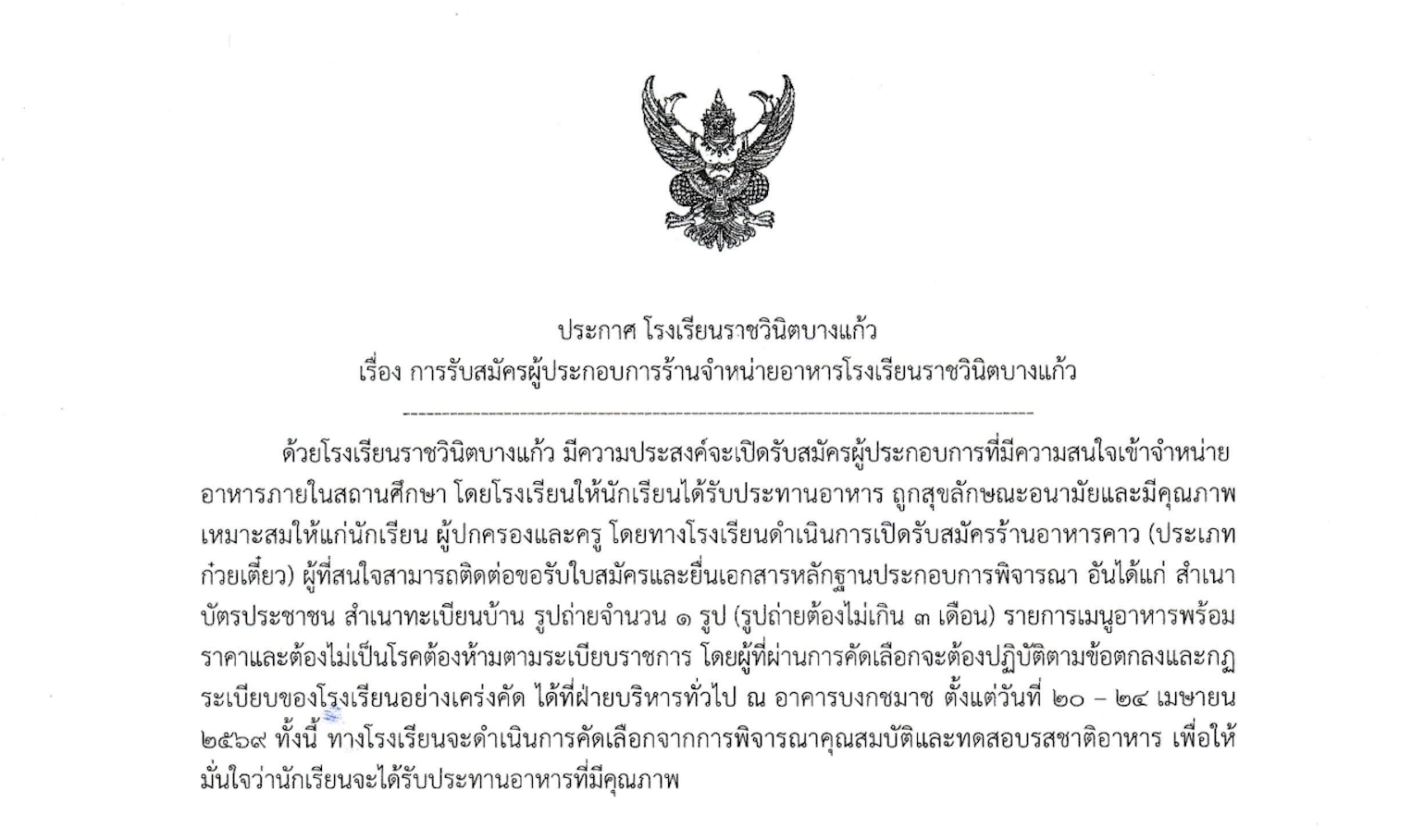 ประกาศการรับสมัครผู้ประกอบการและแจ้งเกณฑ์การประเมินอาหารสำหรับร้านจำหน่ายอาหารโรงเรียนราชวินิตบางแก้ว 10 เมษายน 2026