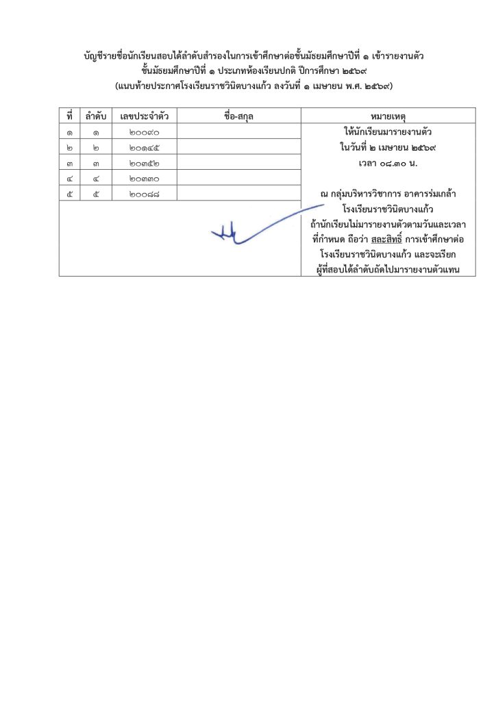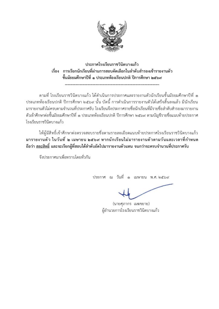 ประกาศการเรียกนักเรียนที่ผ่านการสอบคัดเลือกในลำดับสำรองเข้ารายงานตัว ชั้นม.๑ ห้องเรียนปกติ ปีการศึกษา ๒๕๖๙