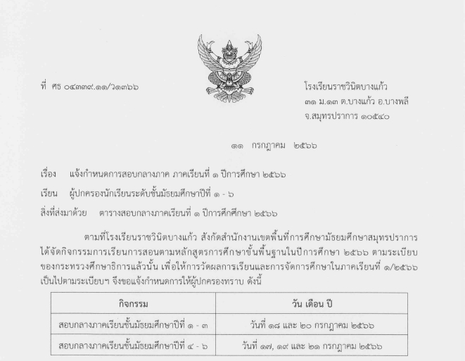 แจ้งกำหนดการสอบกลางภาค ภาคเรียนที่ ๑/๒๕๖๖ ชั้นม.๑-ม.๖