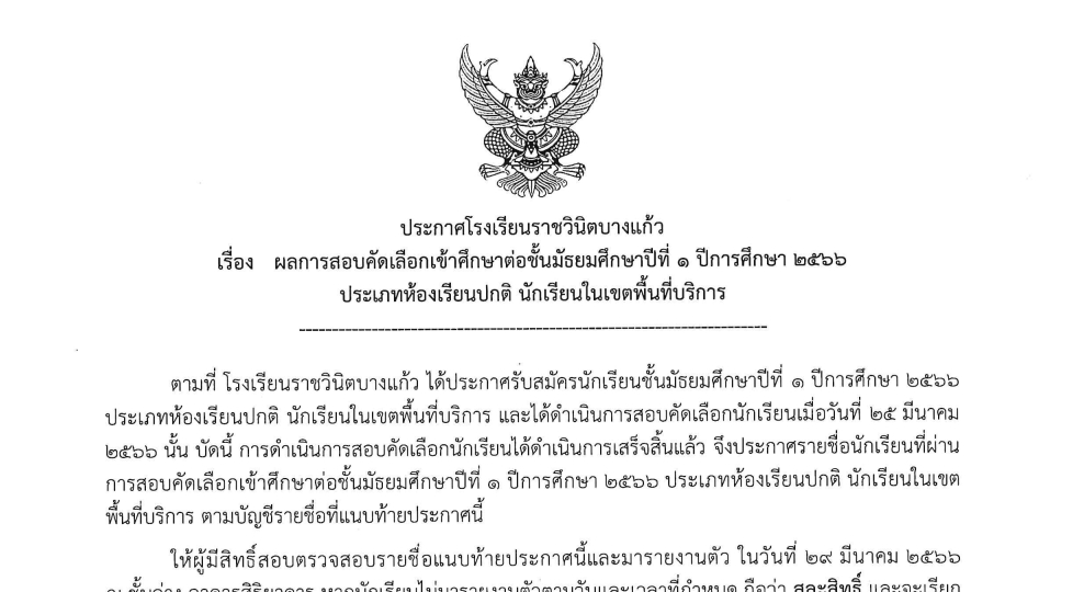 23 มีนาคม 2023รายชื่อผู้มีสิทธิ์สอบคัดเลือกเข้าศึกษาต่อชั้นม.๑ และ ม.๔ ปีการศึกษา ๒๕๖๖ ประเภทห้องเรียนปกติ