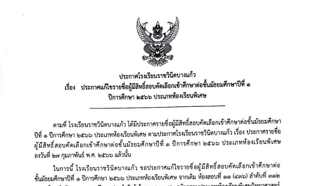 ประกาศรายชื่อผู้มีสิทธิ์สอบคัดเลือกเข้าศึกษาต่อชั้น ม.๑ และ ม.๔ ปีการศึกษา ๒๕๖๖ ประเภทห้องเรียนพิเศษ