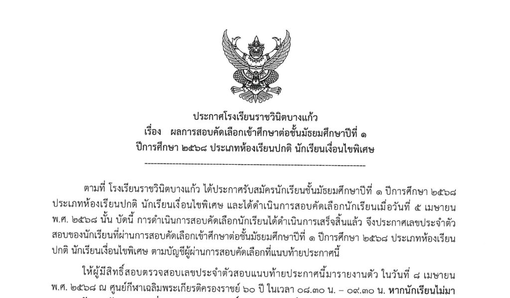 6 เมษายน 2025ผลการสอบคัดเลือกเข้าศึกษาต่อชั้นมัธยมศึกษาปีที่ ๑ ปีการศึกษา ๒๕๖๘ ประเภทห้องเรียนปกติ นักเรียนทั่วไป