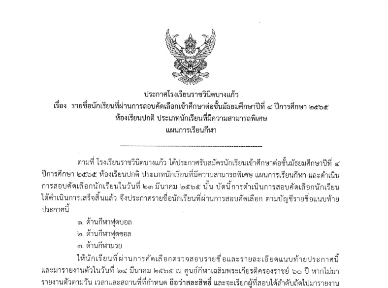 21 มีนาคม 2022รายชื่อผู้มีสิทธิ์สอบคัดเลือกเข้าศึกษาต่อ ระดับชั้น ม.๑ และ ๔ ปีการศึกษา ๒๕๖๕ ห้องเรียนปกติ ประเภทนักเรียนที่มีความสามารถพิเศษ
