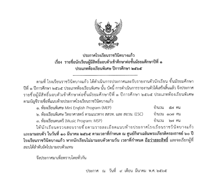 รายชื่อนักเรียนผู้มีสิทธิ์มอบตัวเข้าศึกษาต่อชั้นมัธยมศึกษาปีที่ ๑ และ ๔ ประเภทห้องเรียนพิเศษ ปีการศึกษา ๒๕๖๕